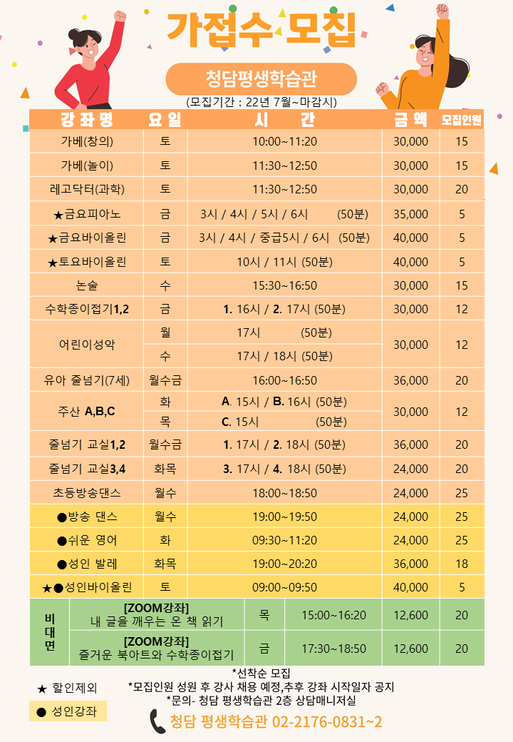 청담 평생학습관 청담평생 가접수 모집(22년7월~) 작성자 관리자 등록일자 2022년 7월 5일 9시 9분 24초 조회 1,815 청담평생학습관 가접수 모집.PNG [ Size : 205.58KB , Down : 673 ] 미리보기 다운로드 목록보기
