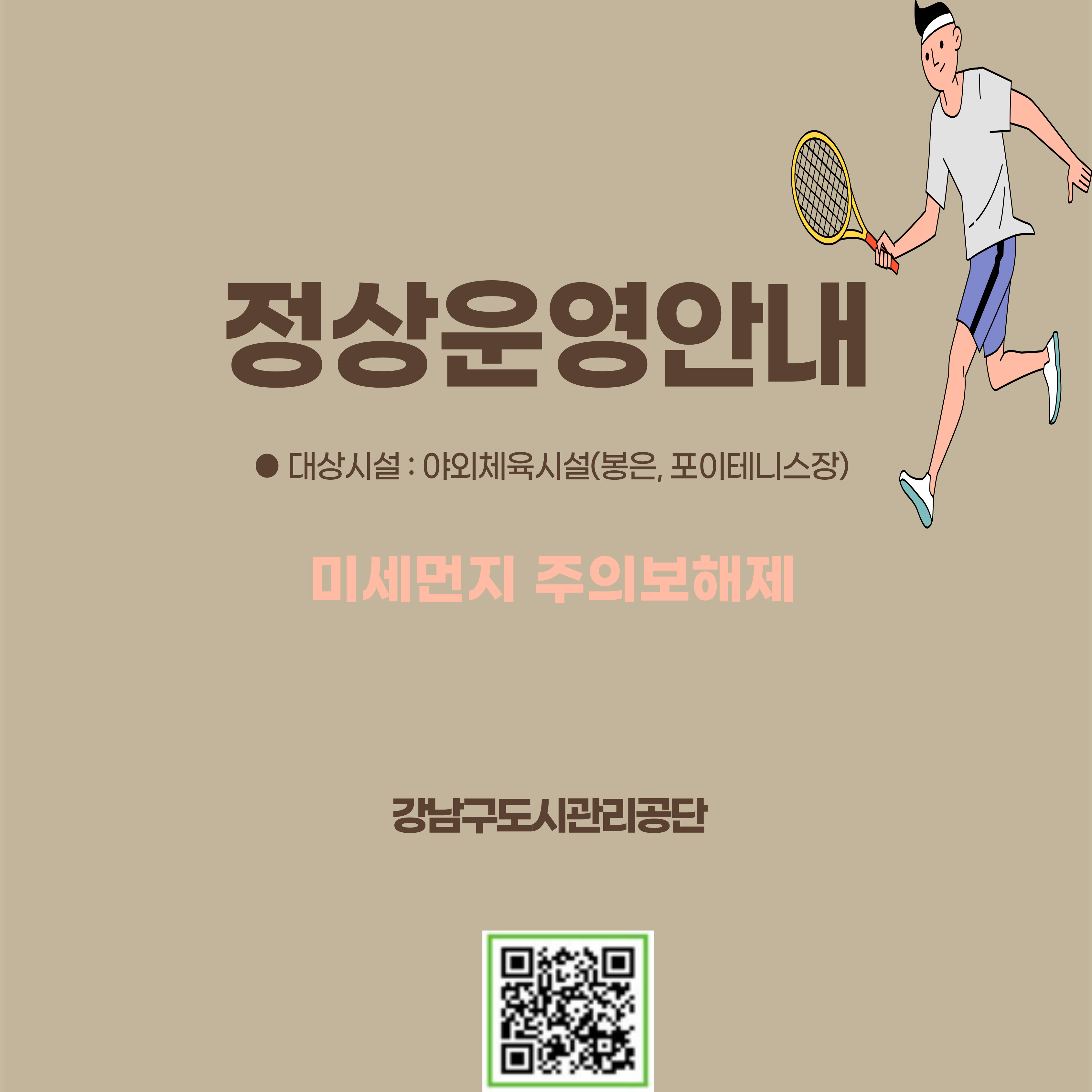 센터 공통 봉은/포이테니스장 정상운영안내(초미세먼지 주의보 해제) 작성자 관리자 등록일자 2022년 2월 14일 13시 18분 51초 조회 1,118 정상운영안내.jpg [ Size : 480.22KB , Down : 1,072 ] 미리보기 다운로드 목록보기