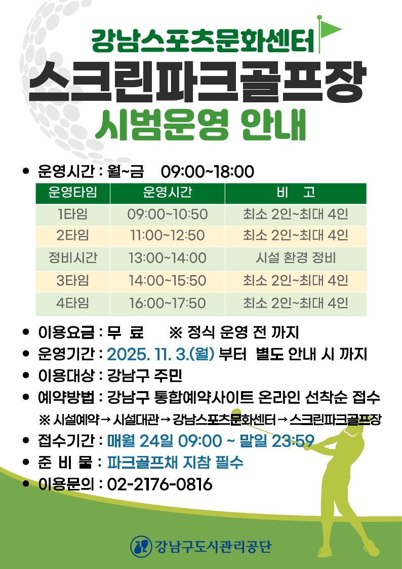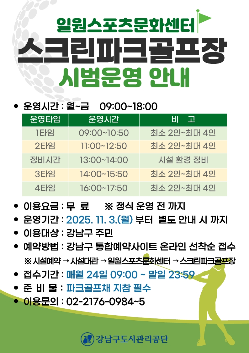 공지 강남구도시관리공단 구립체육시설 스크린파크골프장 시범운영 안내(12월분 ~ 별도 안내 시) 작성자 체육사업1팀 등록일자 2025년 11월 20일 9시 42분 24초 조회 146 오프라인-안내문_강남센터_20251119.pdf_page_1.png [ Size : 303.54KB , Down : 185 ] 미리보기 다운로드 오프라인-안내문_일원센터_20251119.pdf_page_1.png [ Size : 305.71KB , Down : 163 ] 미리보기 다운로드 목록보기