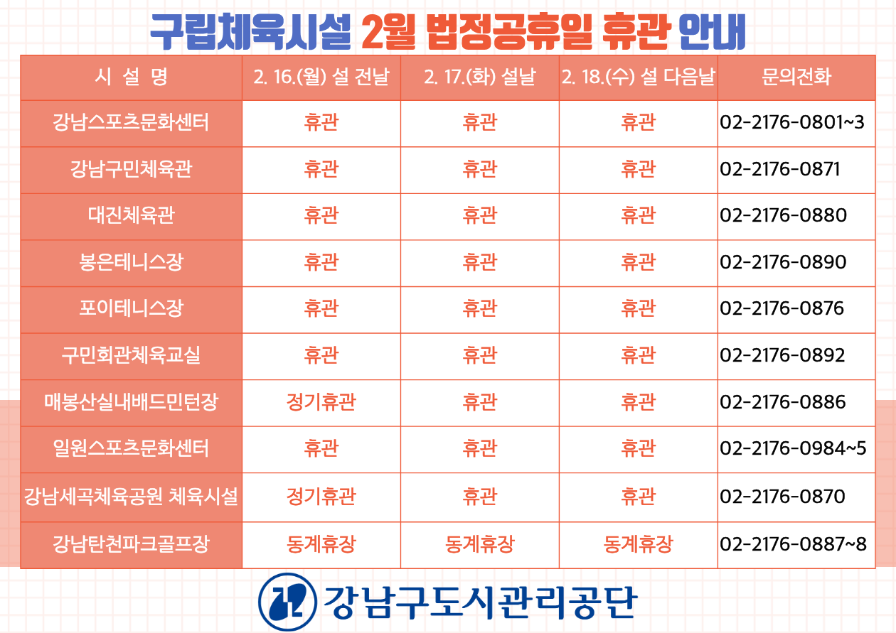 공지 강남구도시관리공단 구립체육시설 2월 법정공휴일 휴관 안내 작성자 체육사업1팀 등록일자 2026년 2월 10일 16시 52분 25초 조회 171 구립체육시설 2월 법정공휴일 휴관안내.pdf [ Size : 985.67KB , Down : 28 ] 다운로드 구립체육시설 2월 법정공휴일 휴관안내.png [ Size : 157.67KB , Down : 63 ] 미리보기 다운로드 목록보기