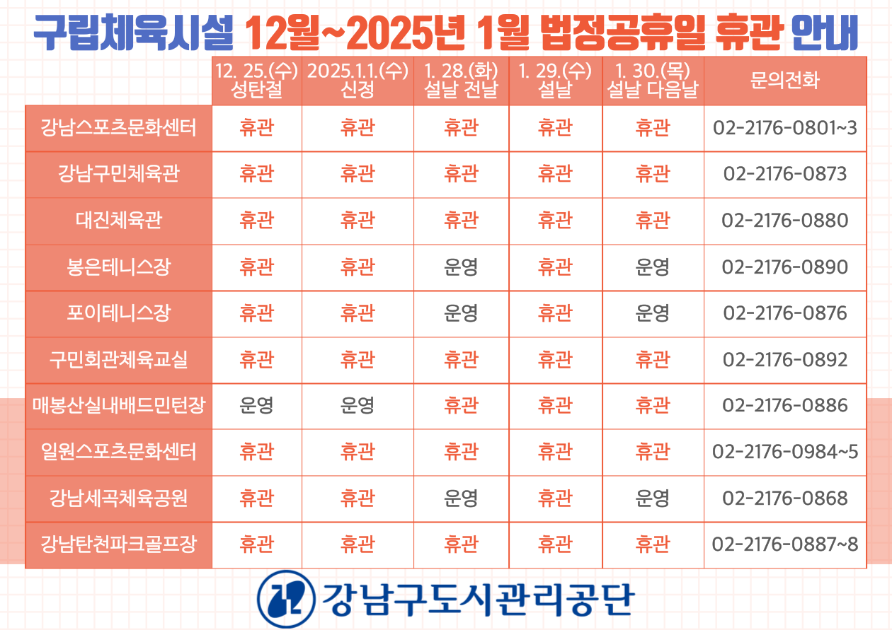 강남구도시관리공단 구립체육시설 2024년 12월~2025년 1월 법정공휴일 휴관 안내
