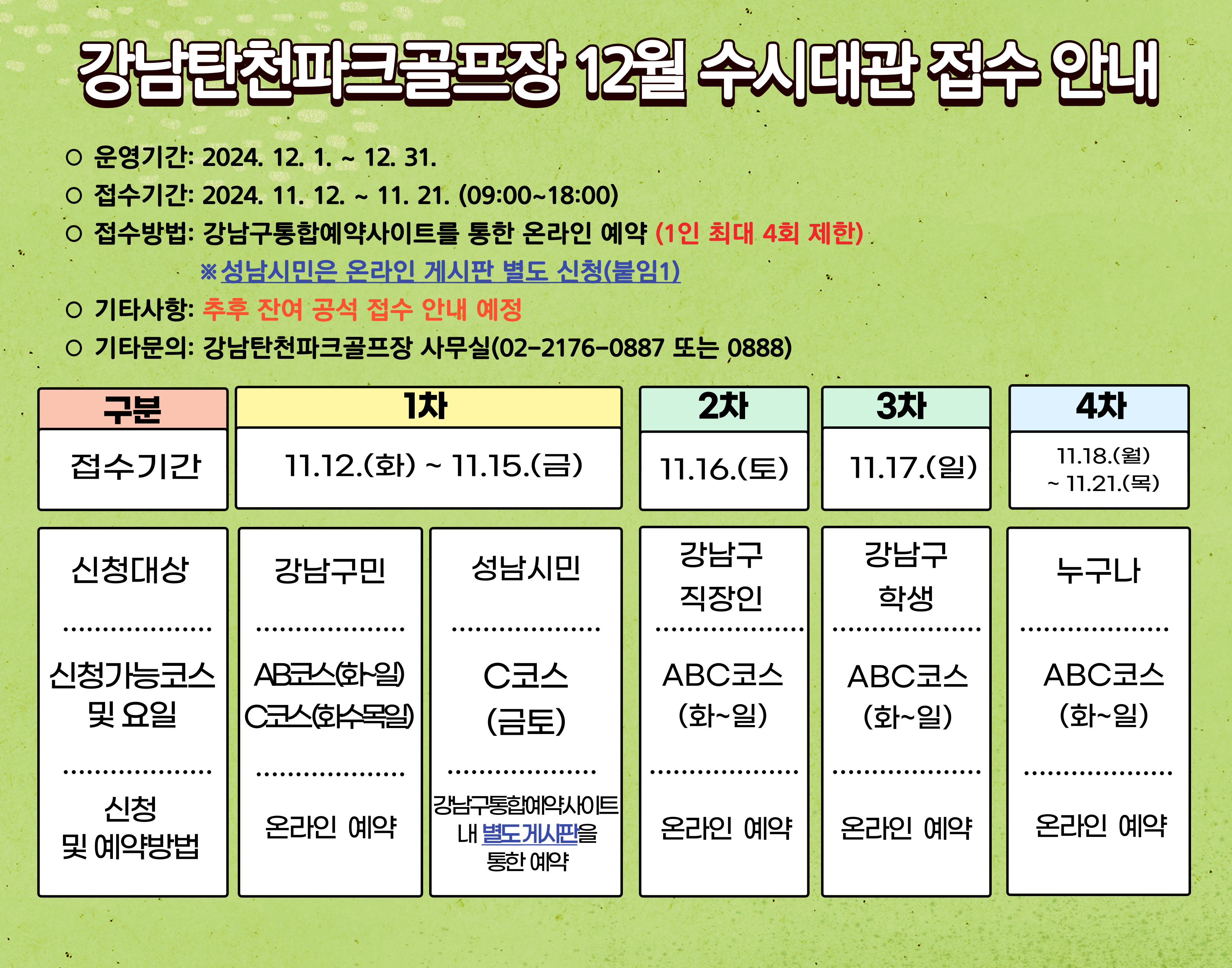 탄천파크골프장 강남탄천파크골프장 12월 수시대관 접수 안내 작성자 체육사업1팀 등록일자 2024년 11월 7일 15시 46분 19초 조회 1,155 강남탄천파크골프장 12월 수시대관 접수 안내.jpg [ Size : 1.68MB , Down : 1,571 ] 미리보기 다운로드 목록보기