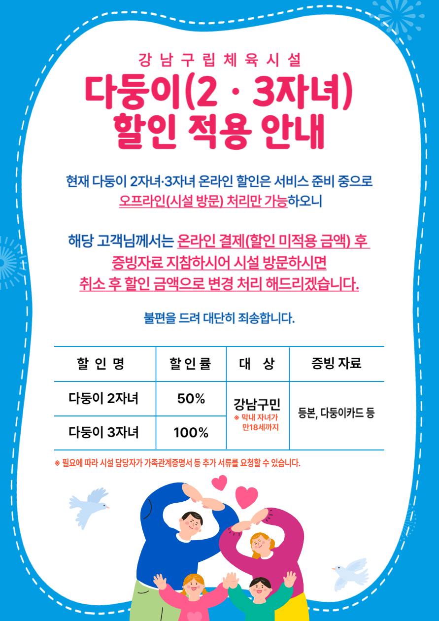 강남구도시관리공단 구립체육시설 다둥이(2자녀·3자녀) 할인 적용 안내