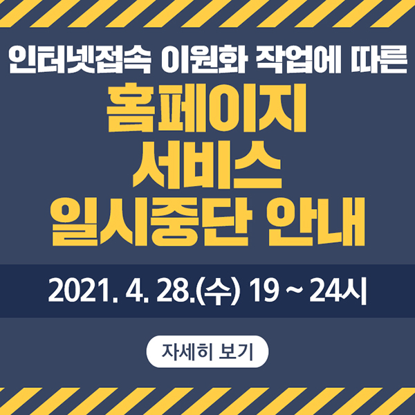 센터 공통 인터넷접속 이원화 작업에 따른 홈페이지 일시중단 안내 작성자 관리자 등록일자 2021년 4월 27일 17시 50분 32초 조회 868 ea74b089-a992-46ca-a75c-e089633d5778.jpg [ Size : 247.03KB , Down : 397 ] 미리보기 다운로드 목록보기