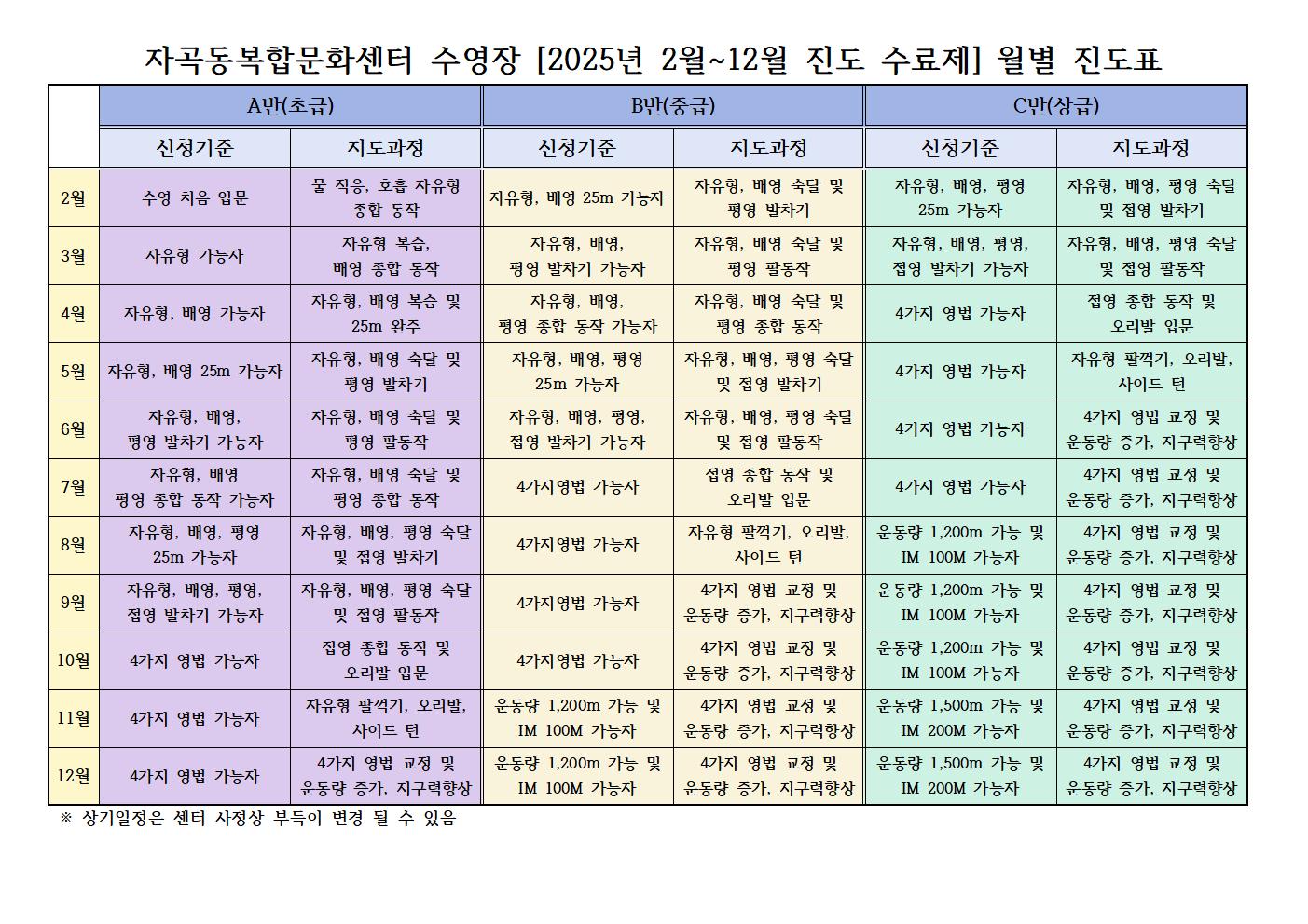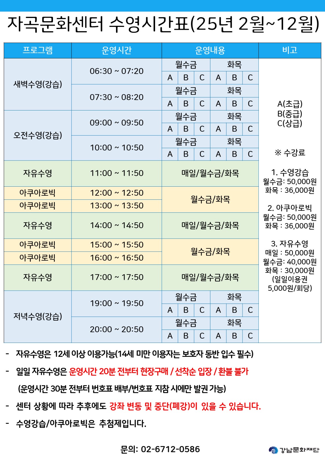 공지 자곡동복합문화센터 자곡동복합문화센터 수영장 시간표(2025년 2월~12월) 작성자 자곡문화센터 등록일자 2025년 4월 22일 12시 10분 36초 조회 1,153 자곡동복합문화센터수영장 시간표 안내_25년.jpg [ Size : 335.04KB , Down : 1,251 ] 미리보기 다운로드 진도 수료제 월별 진도표(25년) (1)001.jpg [ Size : 266.27KB , Down : 1,359 ] 미리보기 다운로드 목록보기