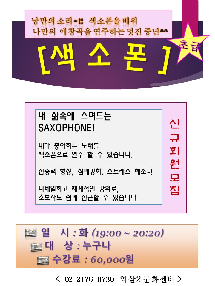 역삼2동복합문화센터 역삼2문화센터 <색소폰>초급 신규회원 모집 작성자 관리자 등록일자 2020년 1월 17일 9시 17분 0초 조회 1,404 슬라이드1.JPG [ Size : 124.12KB , Down : 1,043 ] 미리보기 다운로드 목록보기