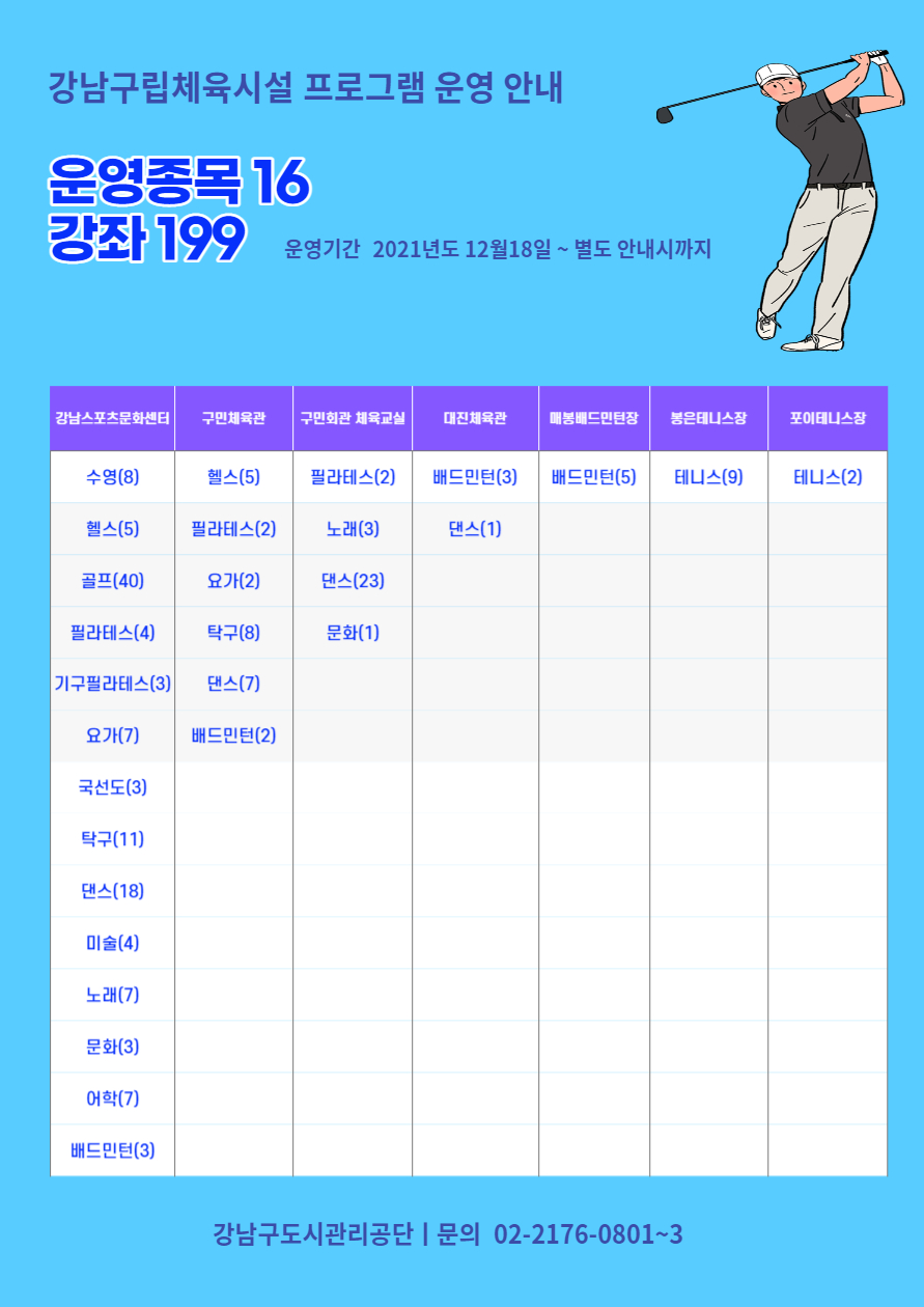 센터 공통 강남구립체육시설 운영종목 안내(2021.12.18~) 작성자 관리자 등록일자 2021년 12월 21일 14시 10분 41초 조회 1,047 20211219_사회적거리두기강화에따른 구립체육시설 변경 운영 보고2.jpg [ Size : 378.72KB , Down : 1,398 ] 미리보기 다운로드 목록보기