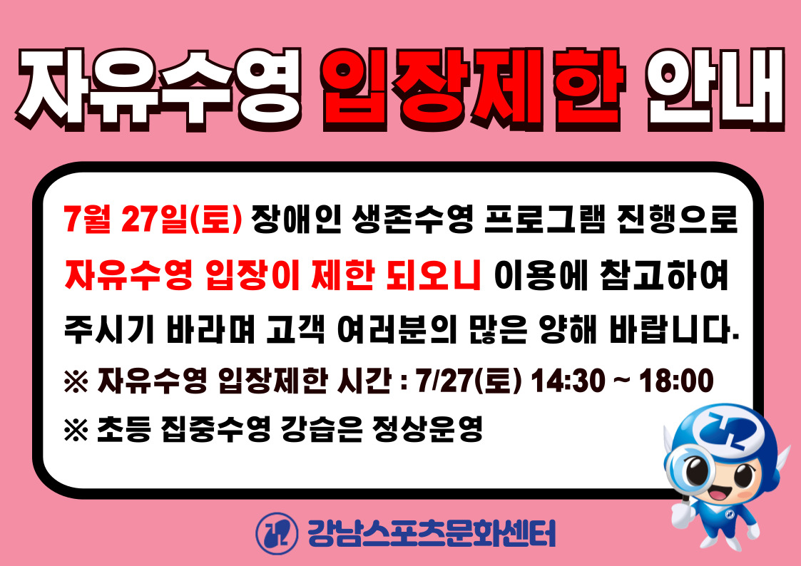 강남스포츠문화센터 강남스포츠문화센터 자유수영 입장제한 안내(7월 27일(토) 14:30~18:00) 작성자 체육사업부 등록일자 2024년 7월 25일 15시 43분 18초 조회 1,250 자유수영 입장제한 안내.jpg [ Size : 218.25KB , Down : 1,115 ] 미리보기 다운로드 목록보기