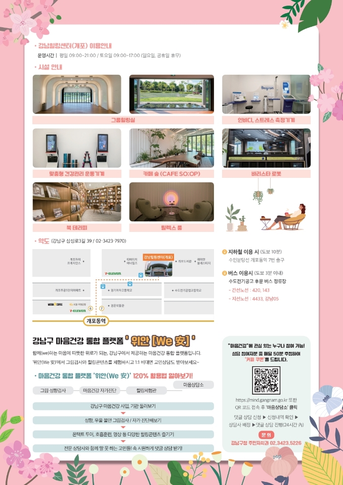 강남구 마음건강 사업 기관둘러보기▶성향, 우울 불안 그림검사/자가진단해보기▶온택트투어 호흡훈련 명상 등 다양한 힐링콘텐츠 즐기기▶전문 상담사와 함께 말 못하는 고민들! 속 시원하게 댓글 상담받기!](/File/Download/8e852f6d2620d04eb4db33ca0128319b)