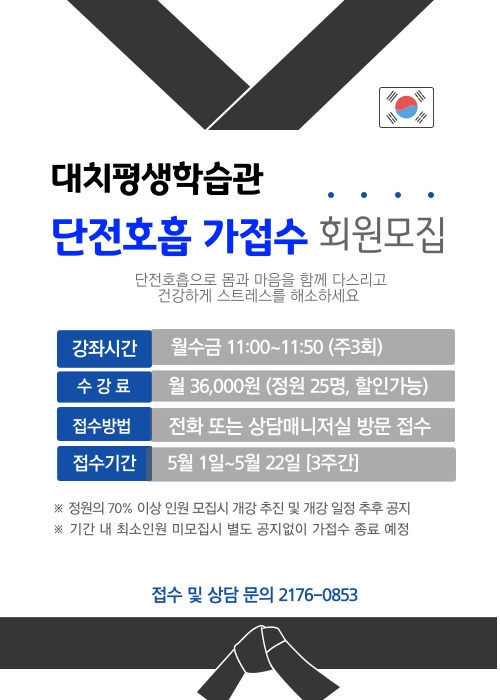 대치 평생학습관 대치평생학습관 단전호흡 가접수 회원 모집 작성자 평생학습관 등록일자 2023년 5월 10일 9시 30분 2초 조회 694 대치평생학습관 단전호흡 가접수 회원 모집.jpg [ Size : 74.74KB , Down : 605 ] 미리보기 다운로드 목록보기