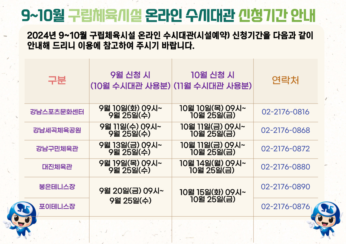 2024년 9~10월 구립체육시설 온라인 수시대관(시설예약) 신청기간을 다음과 같이 안내해 드리니 이용에 참고하여 주시기 바랍니다.