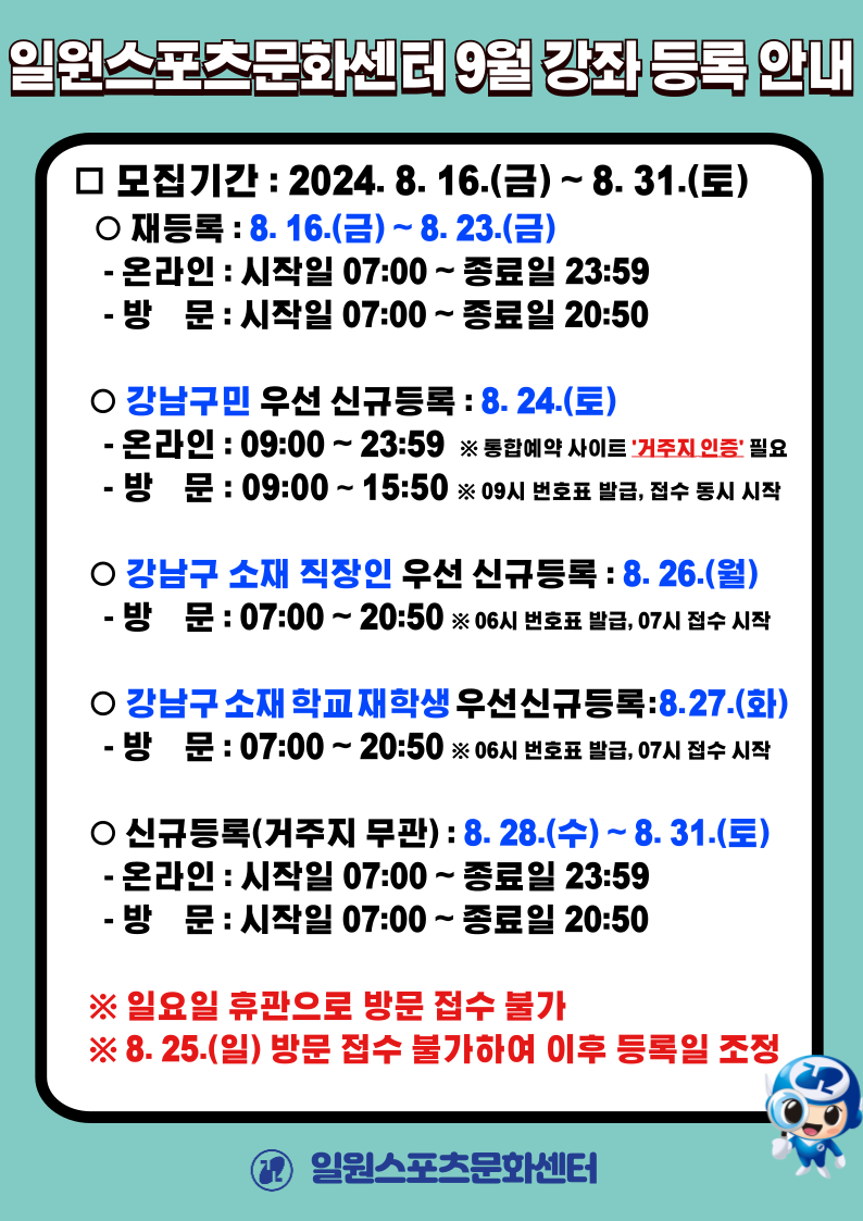 ○ 강남구민 우선 신규등록 : 8. 24.(토)