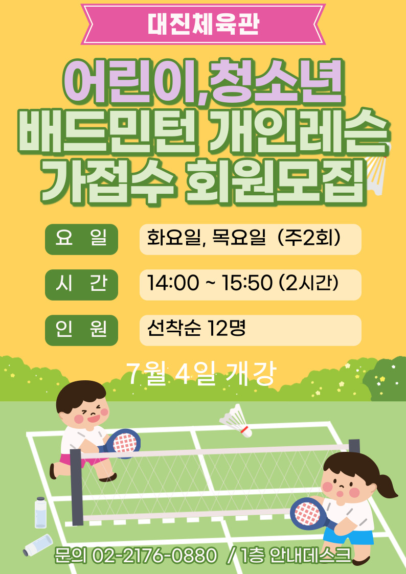 대진체육관 어린이, 청소년 배드민턴 개인레슨 가접수 회원모집