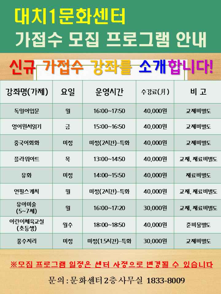 대치1동복합문화센터 대치1문화센터 가접수 모집 프로그램 안내 작성자 관리자 등록일자 2020년 1월 16일 11시 26분 3초 조회 1,534 슬라이드1.PNG [ Size : 376.5KB , Down : 1,364 ] 미리보기 다운로드 목록보기