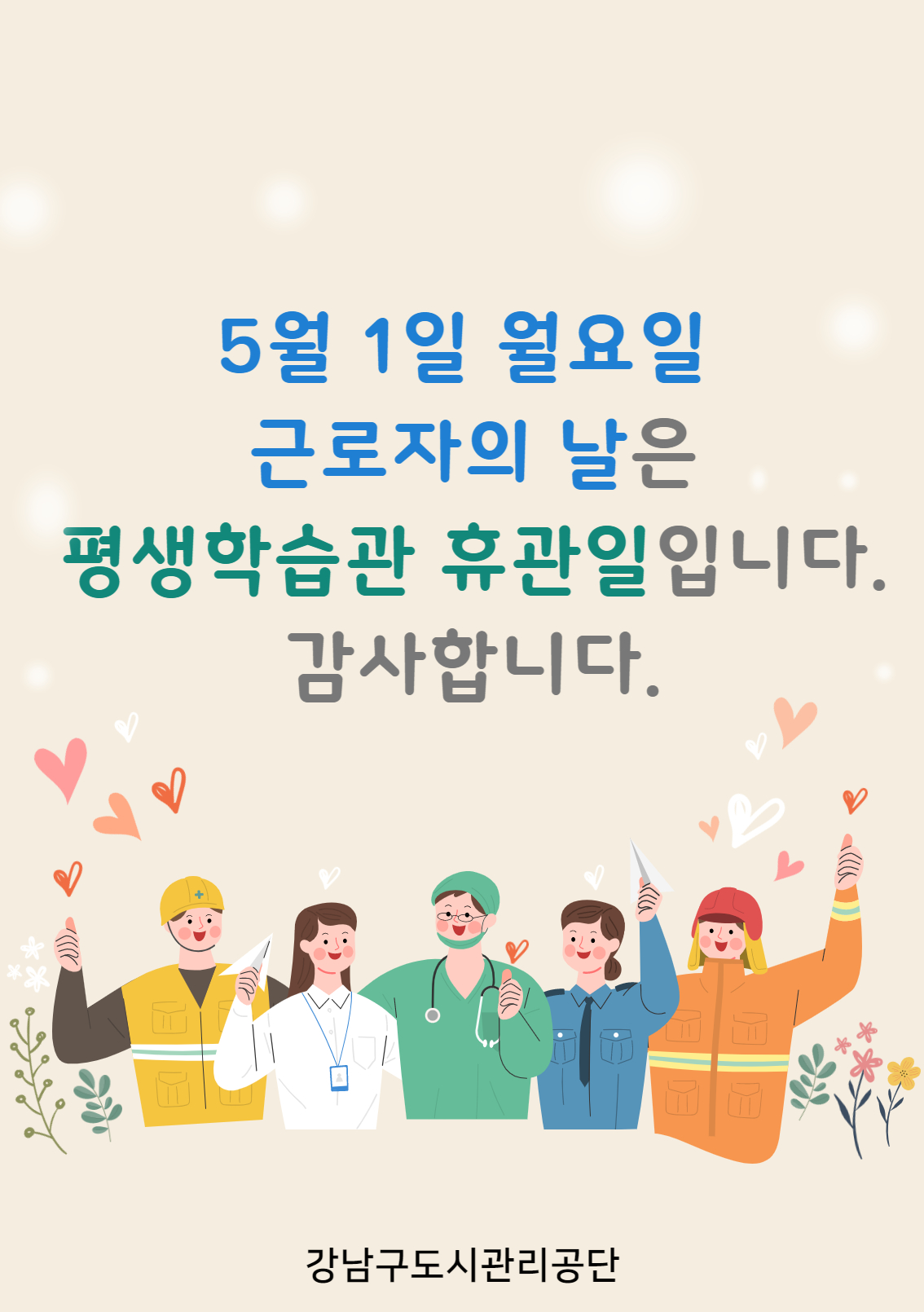 강남구도시관리공단 평생학습관 3개소 근로자의 날 휴무 안내 작성자 평생학습관 등록일자 2023년 4월 28일 11시 43분 39초 조회 754 KakaoTalk_20230428_085827658.jpg [ Size : 533.23KB , Down : 593 ] 미리보기 다운로드 목록보기