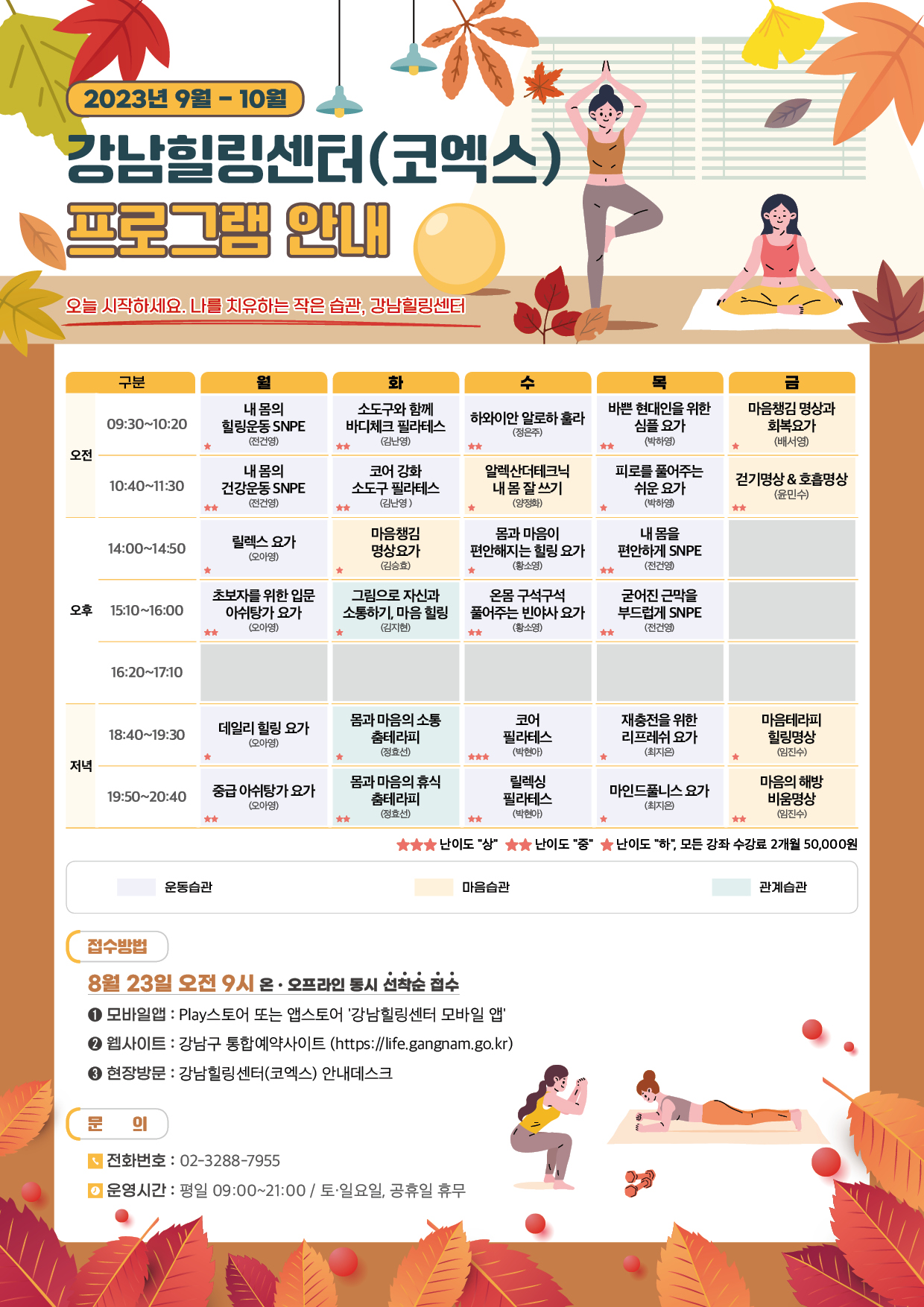 강남힐링센터(코엑스) [2023년 9-10월]강남힐링센터(코엑스) 프로그램안내 작성자 관리자 등록일자 2023년 8월 16일 11시 19분 13초 조회 1,622 리플릿(코엑스).jpg [ Size : 960.57KB , Down : 834,624 ] 미리보기 다운로드 목록보기