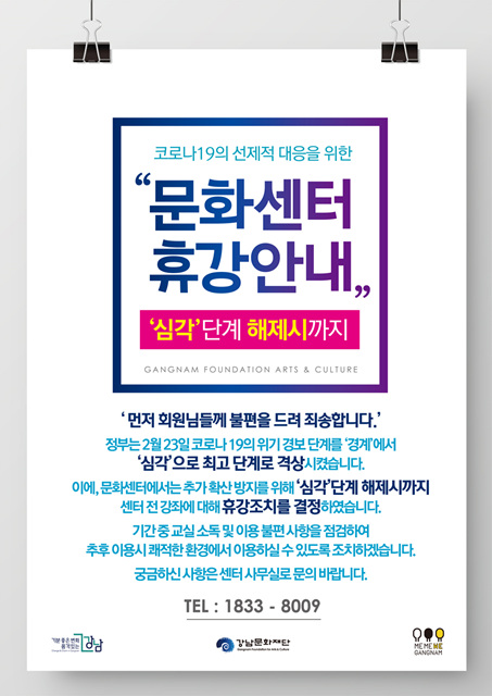 강남문화재단 코로나바이러스감염증-19"심각단계"에 따른 강남문화재단 문화센터 휴강 연장안내 공지 작성자 관리자 등록일자 2020년 2월 25일 13시 11분 4초 조회 3,758 휴강안내문.jpg [ Size : 123.8KB , Down : 7,134 ] 미리보기 다운로드 목록보기