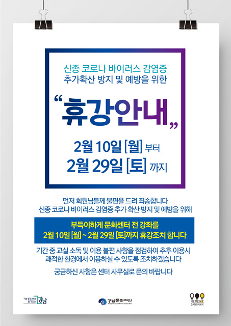강남문화재단 강남문화재단 문화센터 전체 휴강안내 작성자 관리자 등록일자 2020년 2월 9일 12시 4분 29초 조회 1,963 휴강 안내문1.jpg [ Size : 122.54KB , Down : 2,560 ] 미리보기 다운로드 목록보기