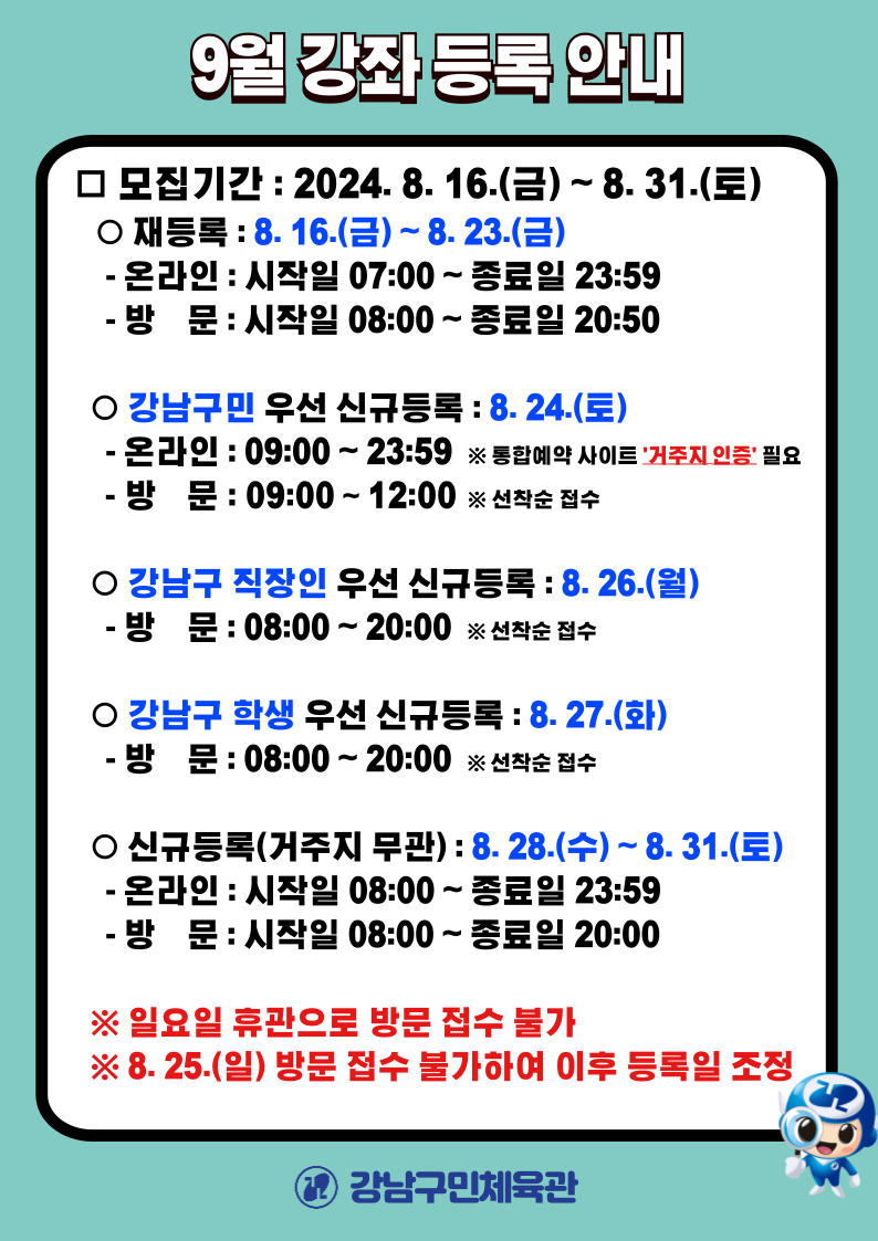 ○ 강남구민 우선 신규등록 : 8. 24.(토)