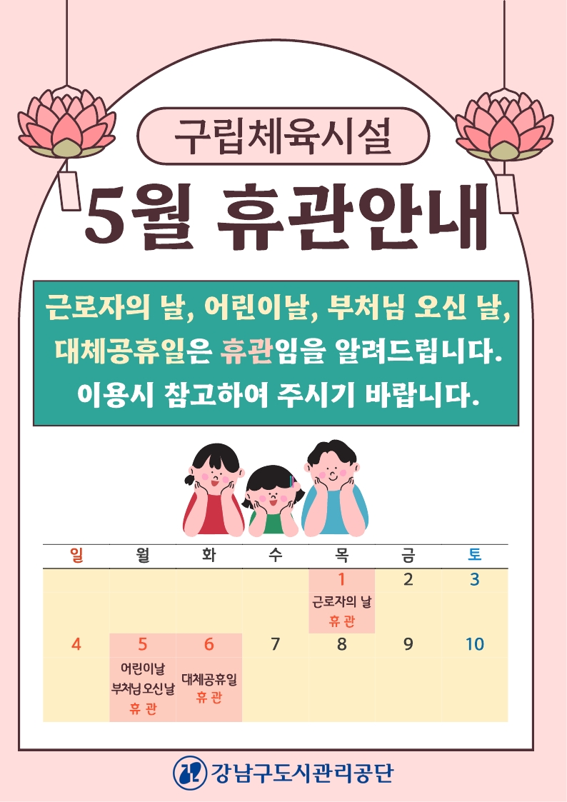 「강남구립체육시설 이용약관」에 따라 구립체육시설 전체 2025년 5월 1일 근로자의 날, 5월 5일 어린이날 및 부처님오신날, 5월 6일 대체공휴일 휴관하오니 구립체육시설 이용에 참고하여 주시기 바랍니다.