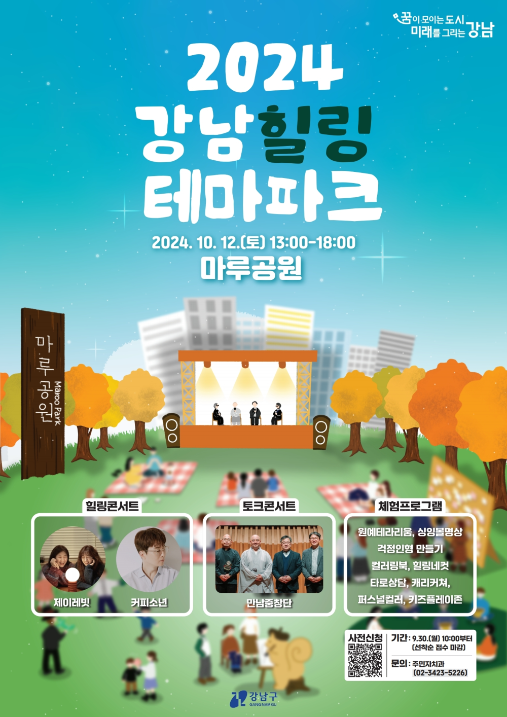 센터 공통 2024 강남힐링 테마파크 2024.10.12.(토) 13:00-18:00 마루공원 작성자 개발자 등록일자 2024년 10월 2일 9시 26분 53초 조회 635 사전접수 바로가기 s_포스터최종시안2 (1)_3037A20240930181523.png [ Size : 1.08MB , Down : 706 ] 미리보기 다운로드 2024강남힐링테마파크안내.pdf [ Size : 1.15MB , Down : 639 ] 다운로드 목록보기