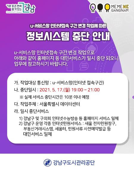 센터 공통 u-서비스망 인터넷접속 구간 변경 작업에 따른 정보시스템 중단 안내 작성자 관리자 등록일자 2021년 5월 17일 14시 23분 11초 조회 884 pop_210517.gif [ Size : 68.09KB , Down : 1,209 ] 미리보기 다운로드 목록보기