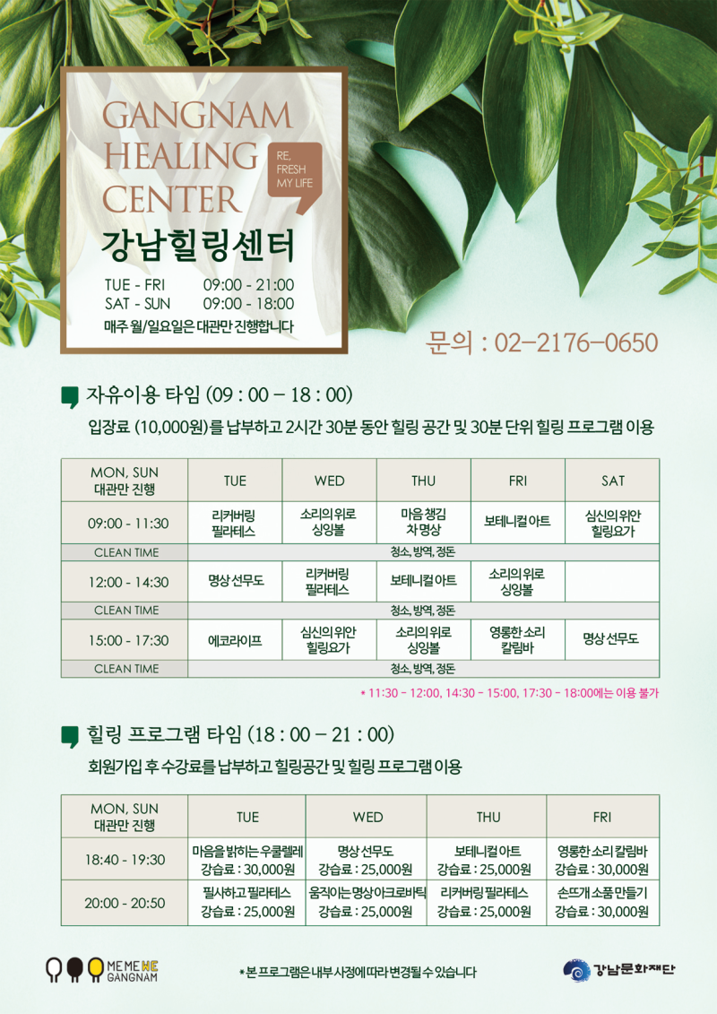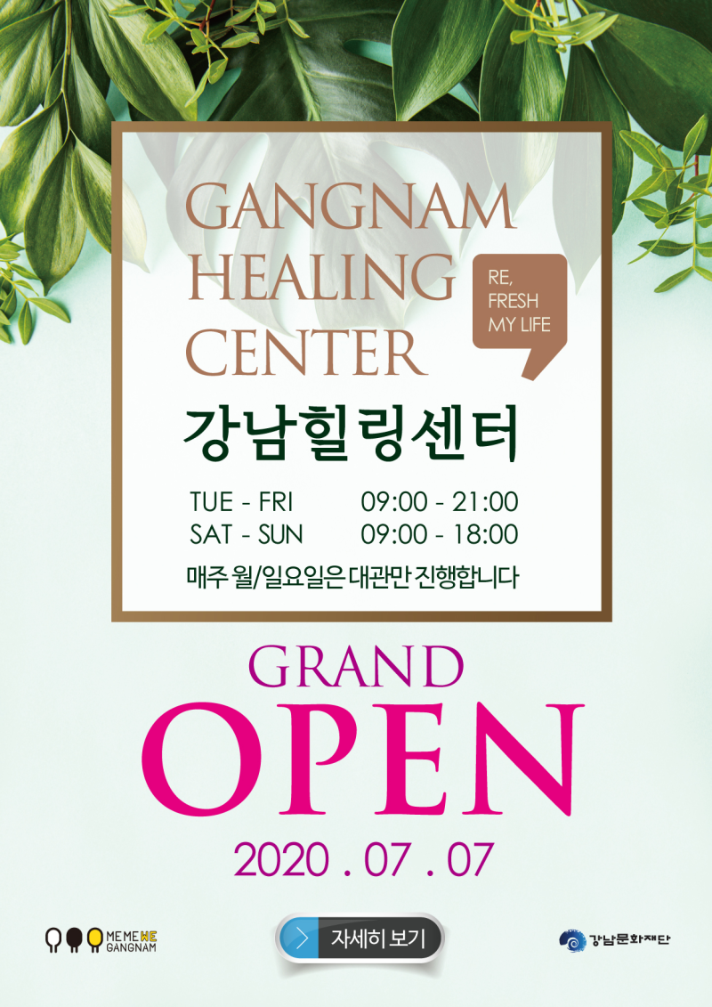 강남문화재단 [강남힐링센터 오픈 안내] 작성자 관리자 등록일자 2020년 7월 2일 16시 3분 57초 조회 3,629 notice_강남힐링센터 (1).png [ Size : 889.08KB , Down : 4,471 ] 미리보기 다운로드 notice_강남힐링센터 (2).png [ Size : 998.64KB , Down : 4,066 ] 미리보기 다운로드 목록보기