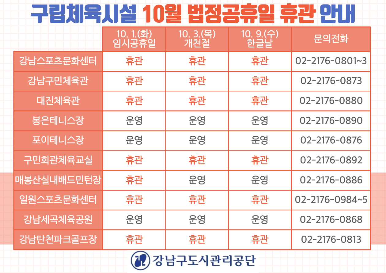 강남구도시관리공단 구립체육시설 10월 법정공휴일 휴관 안내