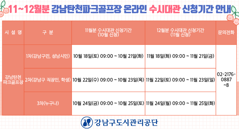 공지 탄천파크골프장 11월분(10월 신청)~12월분(11월 신청) 강남탄천파크골프장 온라인 수시대관(시설예약) 신청기간 안내 작성자 체육사업1팀 등록일자 2025년 10월 2일 11시 7분 45초 조회 994 11~12월분 강남탄천파크골프장 온라인 수시대관 신청기간 안내 배너-20251002.png [ Size : 78.87KB , Down : 2,035 ] 미리보기 다운로드 11~12월분 강남탄천파크골프장 온라인 수시대관 신청기간 안내 배너-20251002.pdf [ Size : 807.12KB , Down : 292 ] 다운로드 목록보기