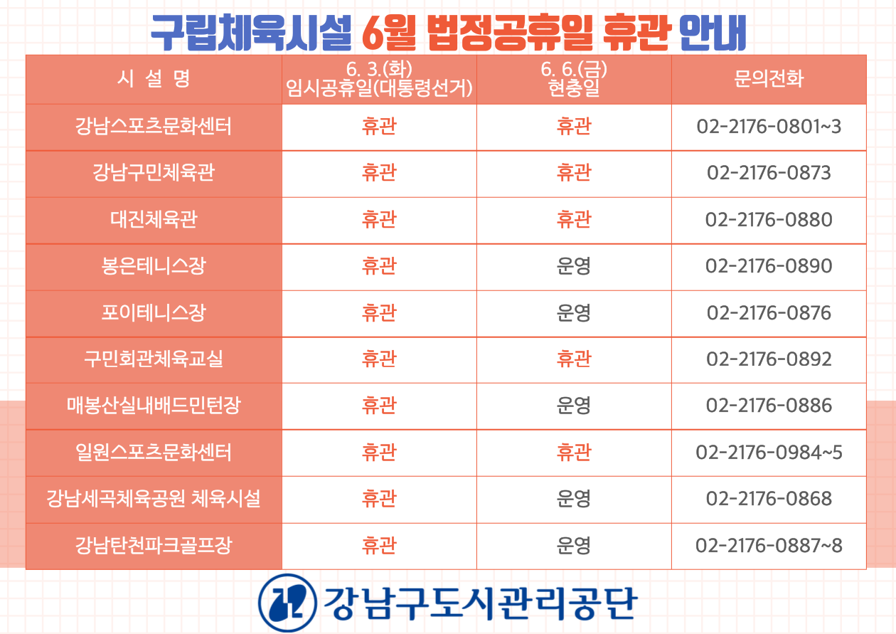 강남구도시관리공단 구립체육시설 6월 법정공휴일 휴관 안내 작성자 체육사업1팀 등록일자 2025년 5월 9일 13시 30분 28초 조회 755 구립체육시설-6월-법정공휴일-휴관안내_20250509-001.png [ Size : 196.1KB , Down : 352 ] 미리보기 다운로드 구립체육시설-6월-법정공휴일-휴관안내_20250509.pdf [ Size : 232.48KB , Down : 404 ] 다운로드 목록보기