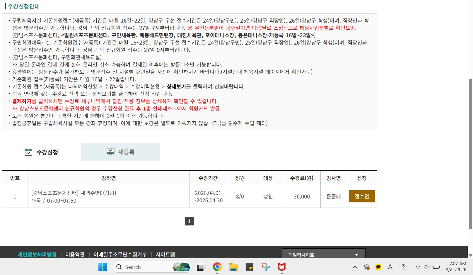 수강신청 수영 강남구민 우선접수 작성자 김문정 작성일 2026년 3월 24일 7시 8분 33초 조회 59 화면 캡처 2026-03-24 070741.jpg [ Size : 273.04KB , Down : 19 ] 미리보기 다운로드 안녕하세요 24일 강남구민 신규접수하려는데 정시가 되어도 접수전인 상태로 신청이 불가합니다(첨부 이미지 참고). 제가 등록 시점을 잘못 알고 있는건지, 시스템 오류인건지 확인 부탁드립니다. 감사합니다. 목록보기