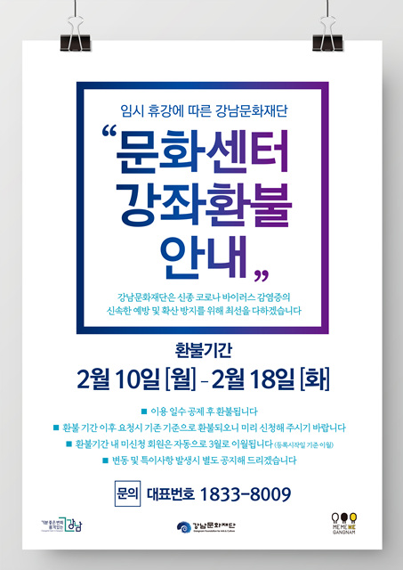 센터이용 강남문화재단 문화센터 휴강에 따른 강좌 환불 및 이월 안내