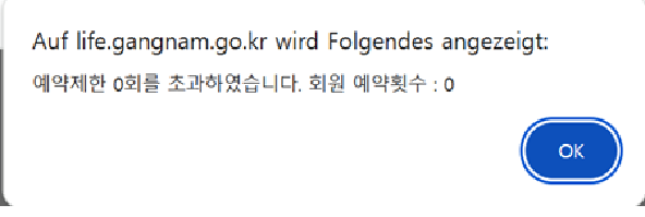 안녕하세요 9월 탄천파크골프를 예약하려고 9시에 접속해서 진행했습니다만, 단 1건의 예약도 성공하지 못했습니다. 제가 알기로는 예약 제한이 2회인 것으로 알고 있는데 처음 예약하기를 눌렀을 때부터 예약 제한 0회를 초과하였다는 팝업창이 뜹니다. 강남구민이고 거주지 확인도 했는데 왜 예약 제한이 0회가 되어 있는 것입니까? 답변 부탁드립니다.