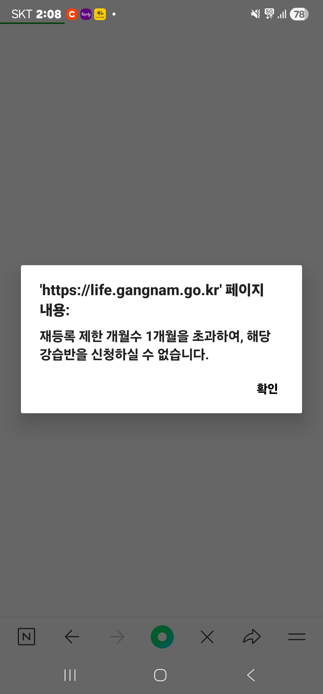 수강신청 재등록 제한개월수초과 작성자 오혜영 작성일 2026년 2월 17일 14시 11분 36초 조회 79 Screenshot_20260217_140802_NAVER.jpg [ Size : 150.62KB , Down : 21 ] 미리보기 다운로드 기존 수강하던 수업을 재등록하려하나 재등록 제한 개월수를 1개월 초과하여 등록할수없다고 팝업이 생성되며 등록할수가없습니다 목록보기